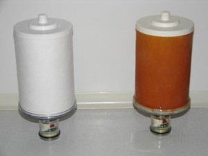 Foto nových a použitých výmenných filtrov zariadení eSpring™ po ročnej prevádzke